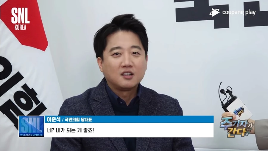 지난 25일 이 대표는 쿠팡플레이 예능 'SNL코리아 시즌2'의 '주기자가 간다' 코너에 출연했다. 인턴 기자 역할을 맡은 배우 주현영은 이 대표에게 "윤석열 국민의힘 대선후보가 대통령 되기'와 '본인이 대통령 되기' 중 어떤 걸 고르겠냐고 물었다. 그러자 이 대표는 "네? 내가 (대통령이) 되는 게 좋다"라고 대답했다.