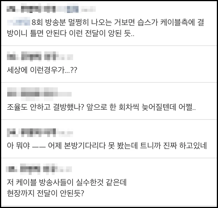 재방송이 본방송보다 먼저 방송된 방송 사고에 네티즌들은 황당하다는 반응을 보였다. 더쿠 네티즌들은 "OTT 서비스에도 안 떴는데 케이블 채널에 8화가 나온다고?", "혹시나 해서 틀었더니 진짜 방송 중이다", "시청률이 잘 안 나와서 마음대로 결방 때린 건가", "이런 건 처음 본다", "조율도 안 하고 결방한 거냐"라는 댓글을 달았다.