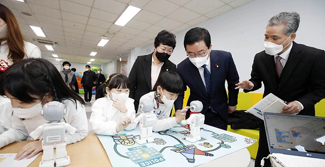 29일 광주시 북구 꿈나무사회복지관에서 문인 북구청장과 아이들이 아동의 건강한 놀 권리 보장과 출산 양육 친화 환경 조성을 위한‘아이낳아 키우기 좋은 행복 북구’ 꿈나무실내놀이터 개소식에서 알파미니 AI로봇 시연을 관람하고 있다.