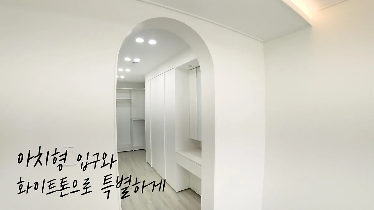 화장실과 연결되는 드레스룸 입구는 수시로 드나드는 점을 감안해 미닫이문을 없앴다. 자칫 밋밋할 수 있는 입구에 아치형 가벽을 만들고 화이트톤으로 꾸며 특색있는 공간으로 탈바꿈했다.