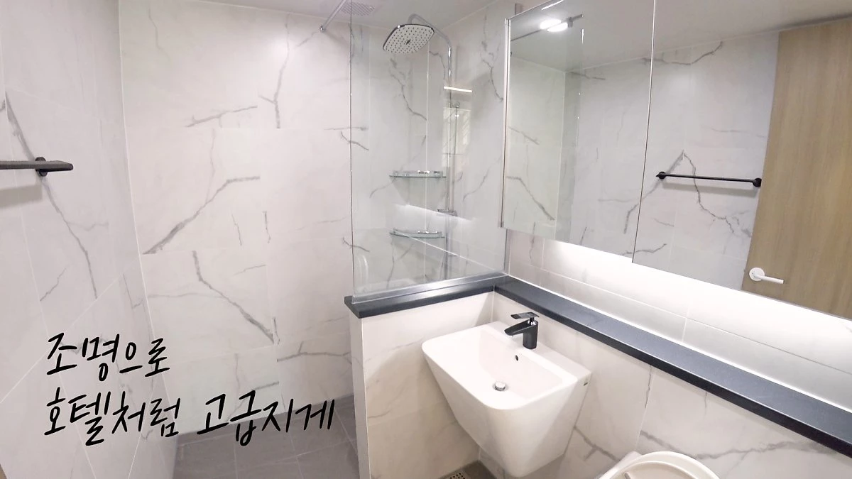 거울 상부장 밑에는 조명을 달아 마치 호텔 욕실처럼 고급스럽게 보이도록 했다.