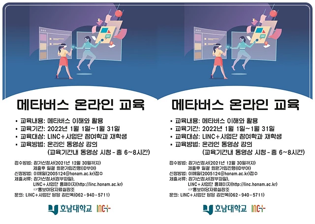 호남대학교 LINC+사업단(단장 양승학)은 1월 한 달 동안 ‘메타버스 이해와 활용’을 주제로 온라인 교육을 실시한다.