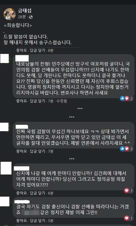 금태섭 전 국민의힘 중앙선거대책위원회 전략기획실장이 선대위를 떠나게 돼 송구하다고 누리꾼들에게 밝혔다.