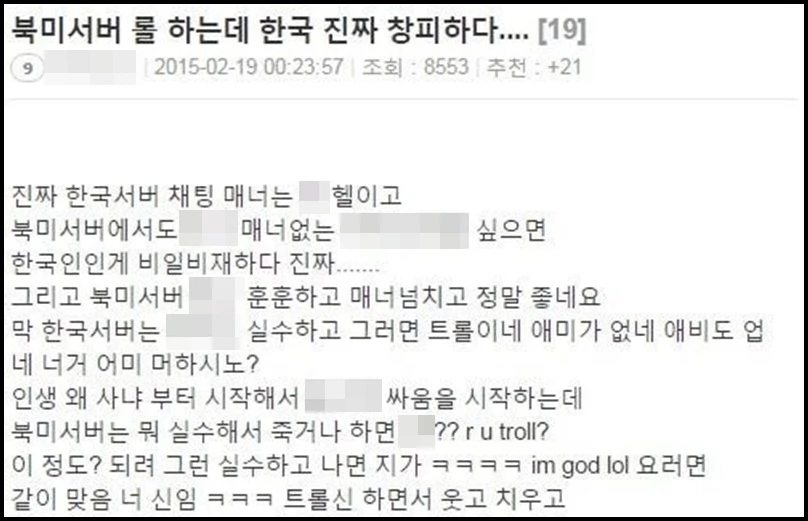 글의 요지는 '리그오브레전드', '스타크래프트', 급기야 '캐치마인드'까지 한국에서 온라인 게임을 할 때 상대방의 실력에 대한 비난 강도가 심각한 수준이라는 점이었다.