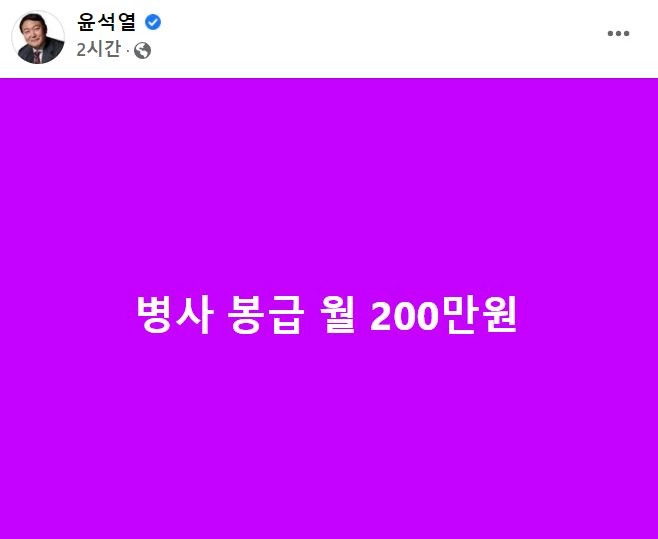 이번에 새로 뜬 공약 사진엔 '병사 봉급 200만 원'이라고 적혀 있다.