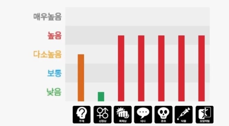 영등위 측이 공개한 내용 정보 서비스란에는 폭력성, 대사, 공포, 약물, 모방위험 항목에서 매우 높음으로 표시됐다.