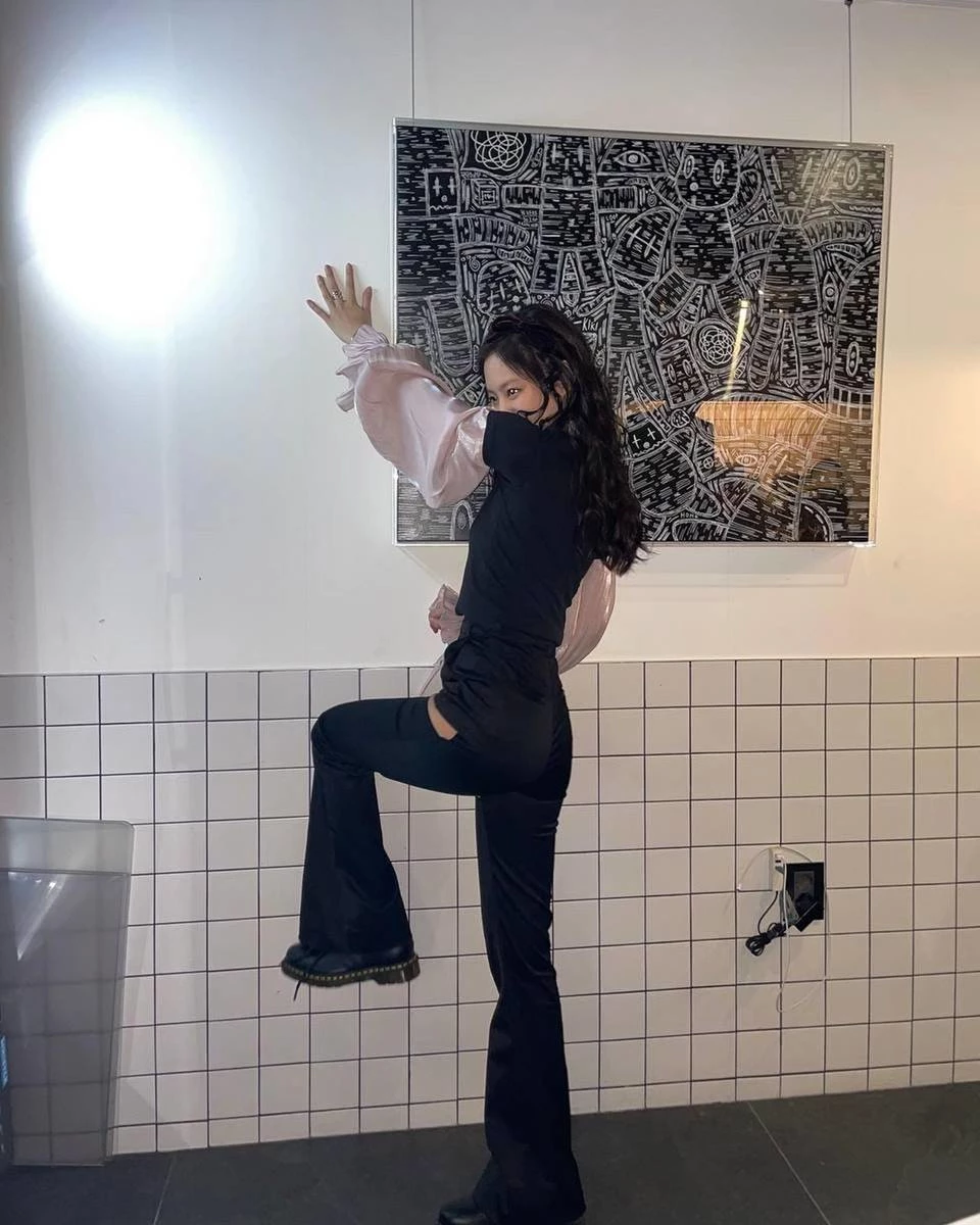 제니는 장미를 들고 다양한 포즈를 취하고 있다. 올 블랙 스타일링에 핑크색 블라우스를 매치했다. 허벅지 부분이 살짝 드러난 독특한 하의가 시선을 사로잡는다.