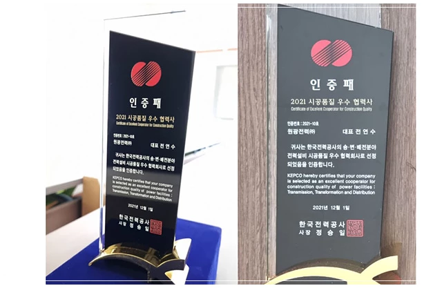 원광전력㈜,한국전력공사 송·변·배전분야 전력설비 시공품질 우수 협력회사 선정