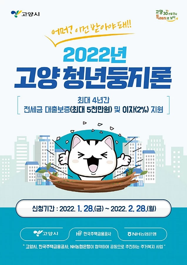 지원대상은 고양시 만 19세~39세 무주택 청년가구 세대주로, 5천만 원이내의 대출보증 및 연 이자 2%(연 100만원 한도)를 지원한다.