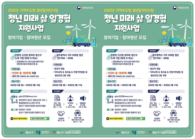 ‘청년 미래 삶 일경험 지원사업’은 광주 광산구의 주력사업인 공기산업분야와 미래성장동력으로 고용창출이 기대되는 친환경 에너지분야에 신규로 정규직 채용계획이 있는 기업을 선정해 최대 2년간 월 180만원의 인건비를 지원한다.