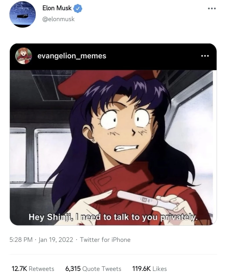 머스크는 19일 자기 트위터에 애니메이션 ‘에반게리온’의 한 장면을 담은 사진을 올렸다. 해당 장면은 한 여성이 "사적으로 할 말이 있어"라고 말하며 임신 양성 반응이 나타나 있는 임신 테스트기를 보여주는 모습을 담고 있다.