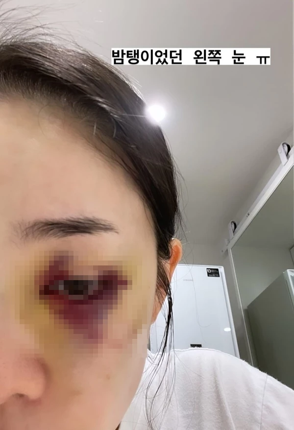공개된 사진 속 박은영은 셀카를 찍으며 시퍼렇게 멍든 왼쪽 눈을 인증했다. 눈가 주위가 부어올랐고, 피멍이 가득해 안타까움을 자아낸다.