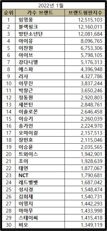 1월 가수 브랜드평판 10위권 여자 가수로 블랙핑크(2위), 아이유(4위), 아이브(6위), 에스파(8위), 리사(9위)가 이름을 올렸고, 나머지는 임영웅(1위), 방탄소년단(3위), 이찬원(4위), 강다니엘(7위), 이무진(10위) 순인 것으로 발표됐다.