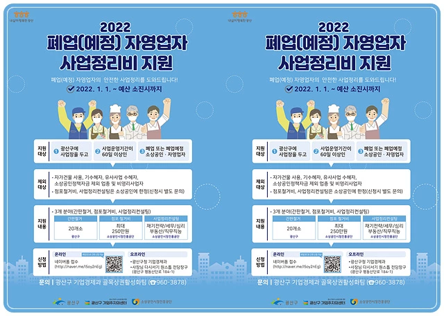 희망자는 광산구 누리집(https://www.gwangsan.go.kr) ‘새소식’란, 온라인 네이버폼(http://naver.me/I5oy2nEg)을 이용해 모바일로 간편하게 신청할 수 있다. 광산구청과 평동종합비즈니스센터(광산구 평동산단로 184-1)에 ‘사장님 다시서기 원스톱 전담창구’도 마련해 현장 접수도 가능하다.