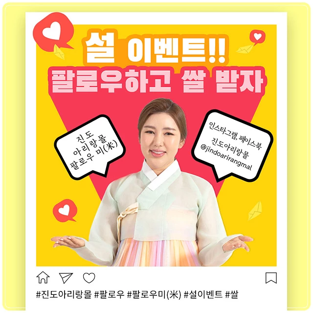 이벤트는 소셜미디어 이용자 누구나 인스타그램·페이스북 등 진도아리랑몰 공식 SNS를 찾아 2월 4일(금)까지 팔로우하고 댓글로 인증하면 된다.