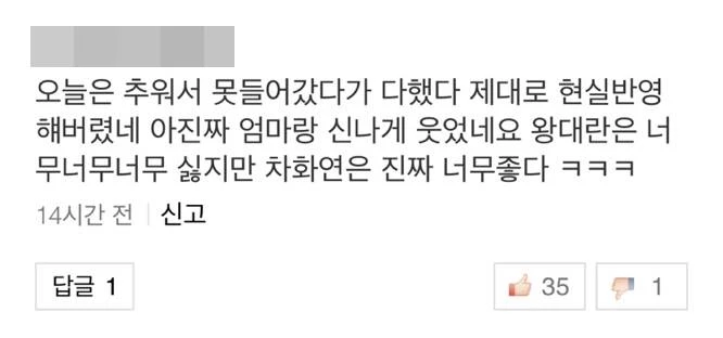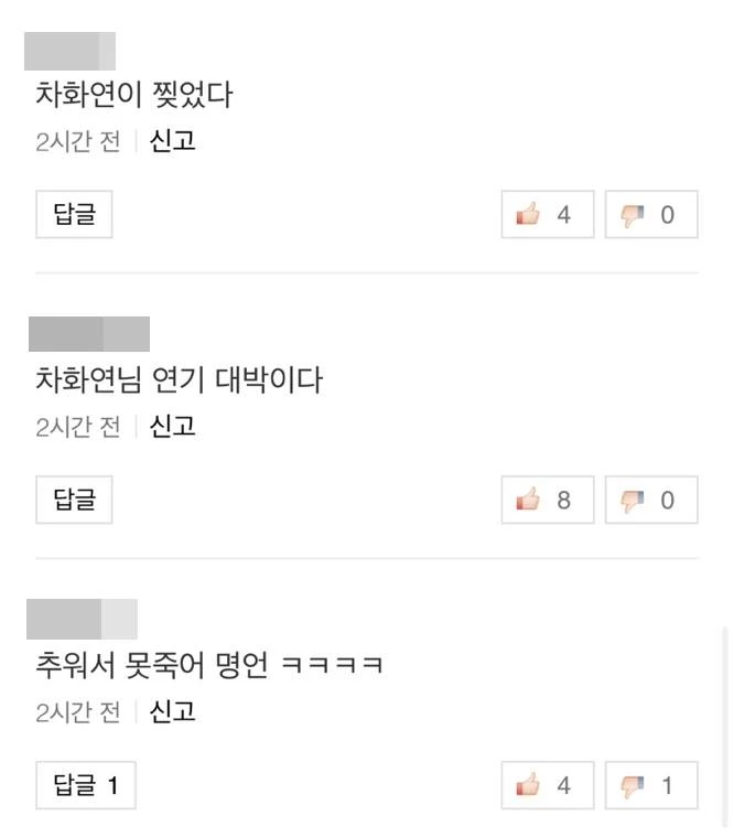 해당 장면을 접한 누리꾼들은 “역대급 장면”이라며 폭소했다. “오늘 최고의 장면이었음ㅋㅋㅋ” “엄마랑 신나게 웃었네요” “차화연이 찢었다” 등의 반응이다. 다음은 네이버TV 댓글창 일부다.