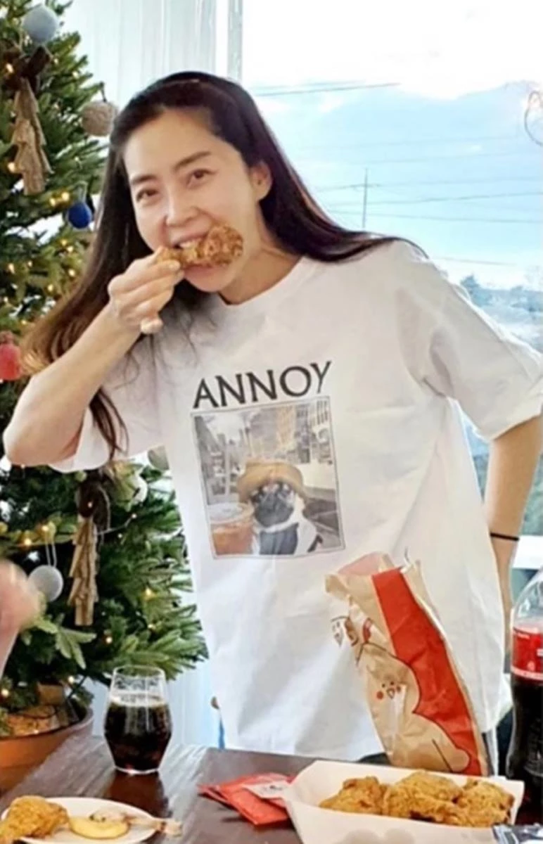 또 송윤아는 테이블에 치킨을 늘어놓은 채 한 손으로 닭다리를 뜯고 있다. 평소 우아한 이미지는 온데간데없이 친근한 매력을 발산한다.