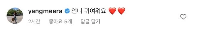 사진을 접한 배우 양미라는 “언니 귀여워요”라며 애정을 드러냈다. 누리꾼들 역시 하트 이모티콘을 쏟아내며 뜨거운 반응을 쏟아냈다.