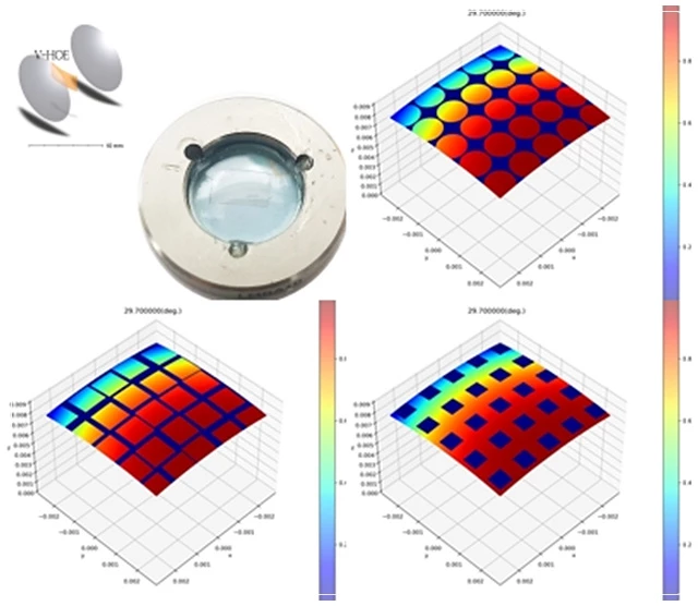 개발한 다중패턴 체적 홀로그램 광학 소자(5mm x 5mm)는 사각형, 모자이크형, 매트릭스형 등의 특수한 기하학적 구조의 형태를 콘택트렌즈(직경 10mm) 내부에 삽입·접착하고, 홀로그램 영상 구현에 필요한 빛의 경로를 제어할 수 있는 간섭무늬(Interference pattern)를 해당 구조에 기록하는 방식으로 제작한다.