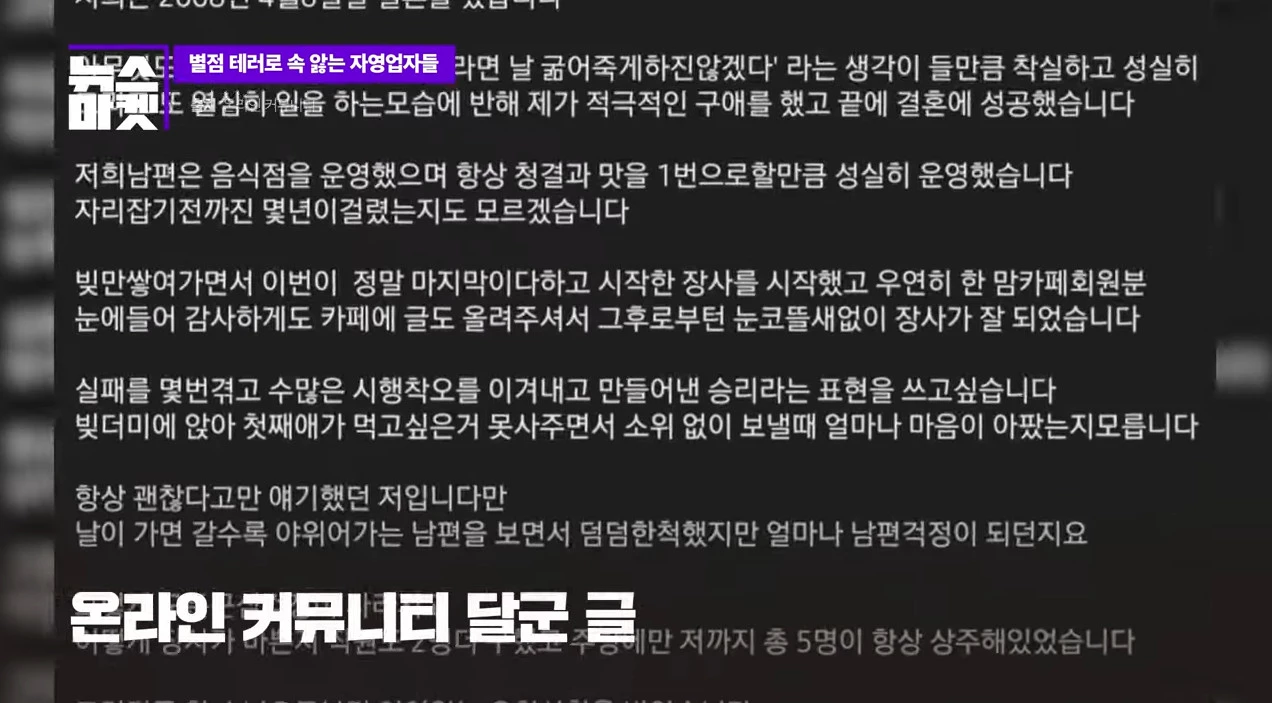 며칠 전 여러 온라인 커뮤니티에는 글 하나가 올라와 많은 이들을 분노하게 했다. 작성자의 남편이 별점 테러로 생을 마감했다는 내용이었다. 빚이 쌓여가던 부부가 마지막으로 연 가게가 카페 회원들에게 미움을 사기 시작하면서 별점이 4.9점에서 2점대로 깎였고, 결국 폐업하게 되어 남편이 생을 마감했다는 울분 섞인 내용이다.