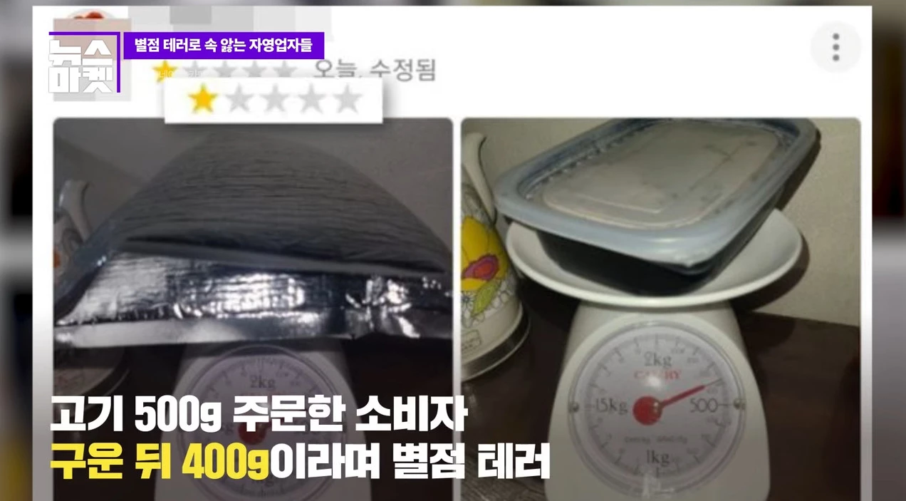 또 다른 별점 테러도 있다. 고기 500g을 주문한 소비자가 남긴 1점짜리 리뷰다. 이 소비자는 음식의 무게를 직접 달아보고 400g밖에 나오지 않자 가장 낮은 점수를 남겼다. 고기가 구워지면서 수분이 증발해 무게가 줄어드는 자연스러운 현상을 이해하지 않았다.