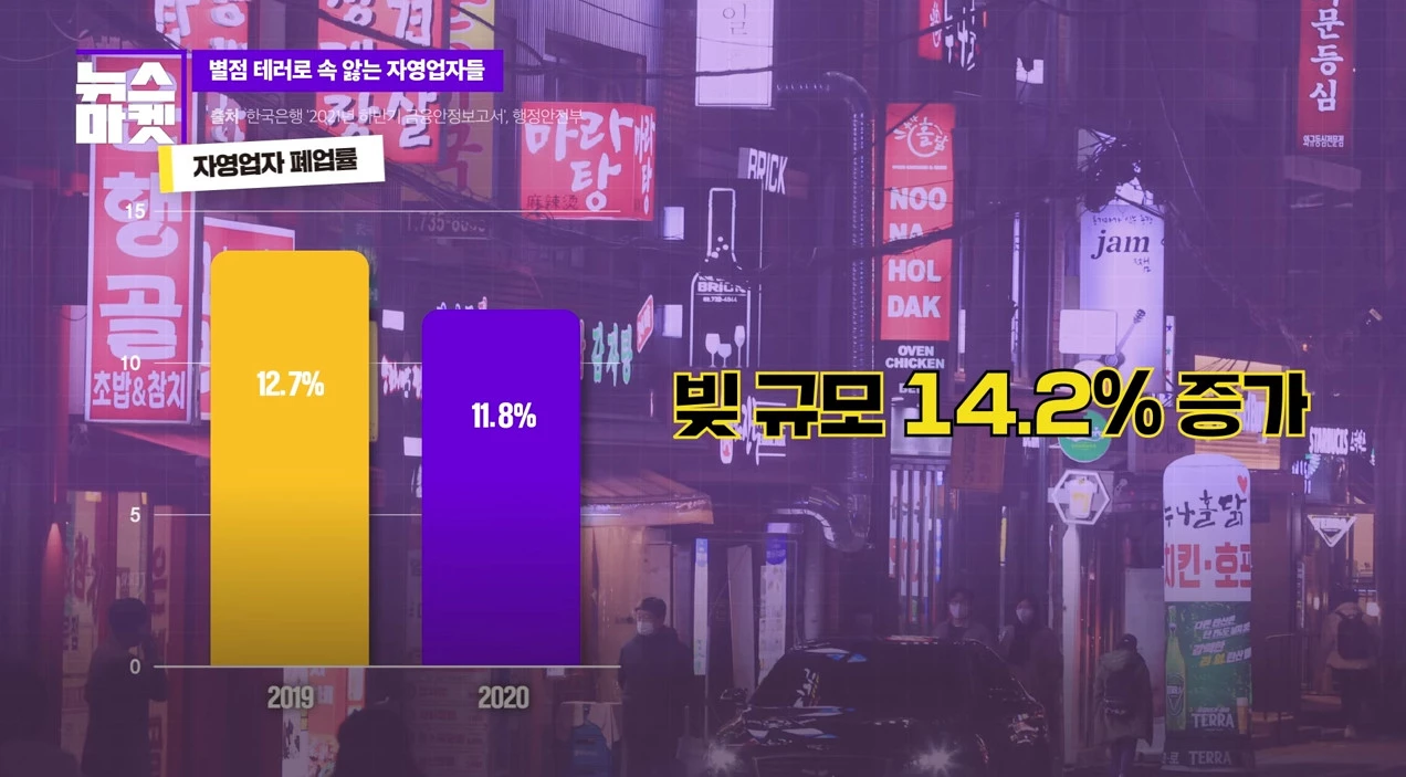 한국은행이 국회에 제출한 내용에 따르면 지난 2020년 말 기준 자영업자 폐업률은 11.8%로, 코로나 이전인 2019년(12.7%)보다 오히려 줄었다. 빚 규모는 14.2%가 늘어났는데, 확실한 대안이 없어 폐업도 쉽지 않은 상황이다. 배달에 의존해왔지만, 새해 들어 기본 배달료가 500원에서 최대 1100원까지 오르면서 이조차 어렵다.