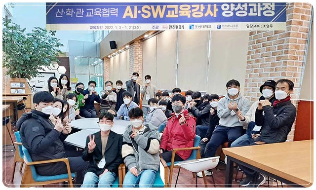 조선대학교 SW중심대학사업단 실습실에서 2022년 1월 3일부터 1월 21일까지 3주간 하루 8시간씩 총 120시간에 걸쳐 진행된 프로그램은 조영주 담당교수를 비롯해 노치상, 김준현, 하태준 조교가 함께 참여해 교육을 진행했다.