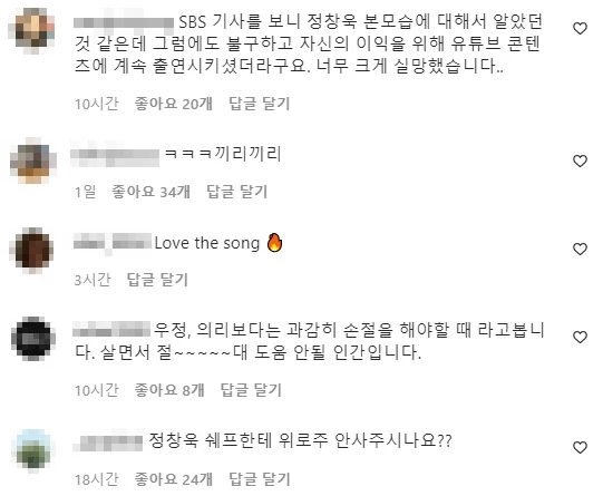 다른 네티즌들 역시 "정창욱 본모습에 대해 알았던 것 같은데 이익을 위해 계속 유튜브 콘텐츠에 출연시킨 거냐. 너무 크게 실망했다", "우정, 의리보다 과감히 손절을 해야할 때라고 본다", "정창욱 절친ㄷㄷ", "정창욱 셰프한테 위로주 안 사주냐", "최자로드에 올라온 정창욱 셰프 영상을 내려달라" 등 댓글을 남기며 최자를 비난했다.