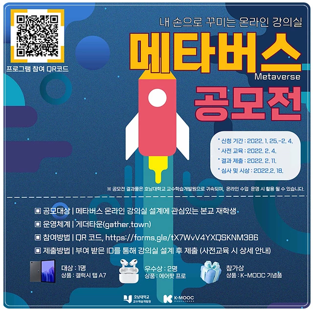 공모전 결과물은 2월 11일 오후 5시까지 제출하면 되며, 2월 18일 시상식을 통해 대상 1명에게는 갤럭시 탭 A7, 우수상 2명에게 에어팟프로, 참가자 전원에게 K-MOOC 기념품을 각각 증정한다.