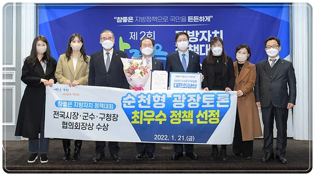 ▲광장토론회 및 정겨운 담소 정례화를 통해서 순천만 스카이큐브 문제 해결, 순천시 대중교통 개선방안, 지역화폐 도입, 천만그루 나무심기 활성화 방안 등을 마련했다. ‘별밤 토크’에서 제안된 외서면의 절임배추를 활용한 김장 나눔행사는 농가의 소득보장과 함께 어려운 이웃돕기도 실천했다. ‘순천형 광장토론’은 지난 달 21일 참 좋은 지방자치 정책대회에서 최우수정책으로 선정돼 전국 시장·군수·구청장협의회장상을 수상하기도 했다.