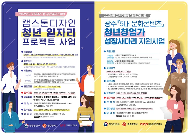 행정안전부와 광주시가 지원하는 『캡스톤디자인 청년 일자리 프로젝트 사업』은 디지털 기반이 취약한 중소 제조/서비스 분야의 “디지털뉴딜” 촉진과 구조 고도화를 위해 청년과 산업체 간 일자리를 매칭하여 인건비 1인당 월 160만원(200만원 기준 80%, 기업부담 20%)을 지원한다. 자격요건은 디지털 디자인 분야의 중소기업(단순업무 제외)과 디지털 디자인 분야 만 39세 이하 미취업 청년이면 누구나 지원 가능하다. 단, 지원기간 중 광주광역시 주민등록은 계속 유지되어야 한다.