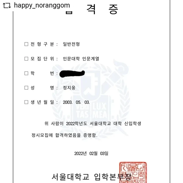 이날 정지웅은 서울대 인문대학 합격증과 함께 합격 수기를 전했다.