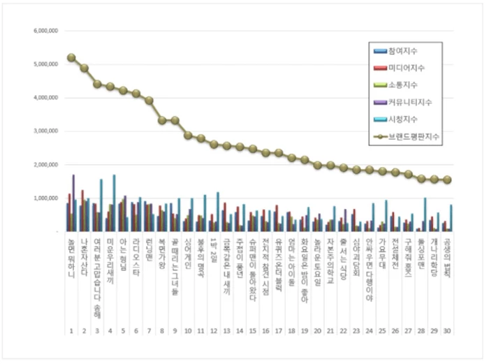 이번 결과는 지난달 6일부터 이달 6일까지 예능 프로그램 50개의 브랜드 빅데이터를 분석해 소비자들의 브랜드 참여와 소통량, 미디어소비, 브랜드 확산량, 소비량을 측정했다.
