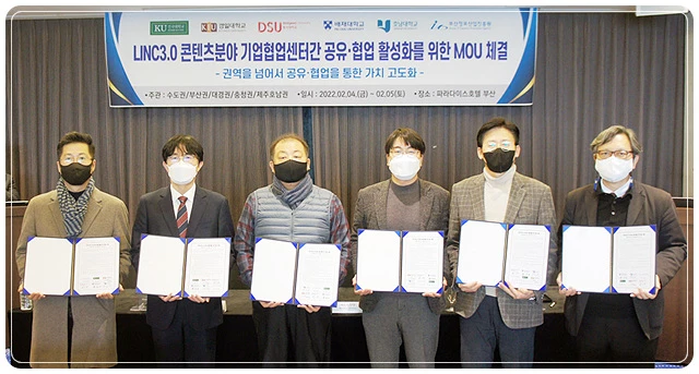 호남대학교 LINC+사업단(단장 양승학)은 2월 4일 부산 파라다이스 호텔에서 LINC+사업 5개 권역별 1개 대학 사업단과 부산정보산업진흥원이 자리한 가운데 문화콘텐츠분야 공유협업 플랫폼 구축을 위해 업무 협약을 체결했다.