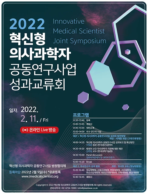 화순전남대학교병원 혁신형의사과학자사업단(단장 신명근 병원장)은 오는 11일 서울 몬드리안 이태원 호텔에서 온·오프라인으로 동시에 열리는 ‘2022 혁신형 의사과학자 공동연구사업 성과 교류회’에 참석, 3년 간의 연구 성과를 발표한다.