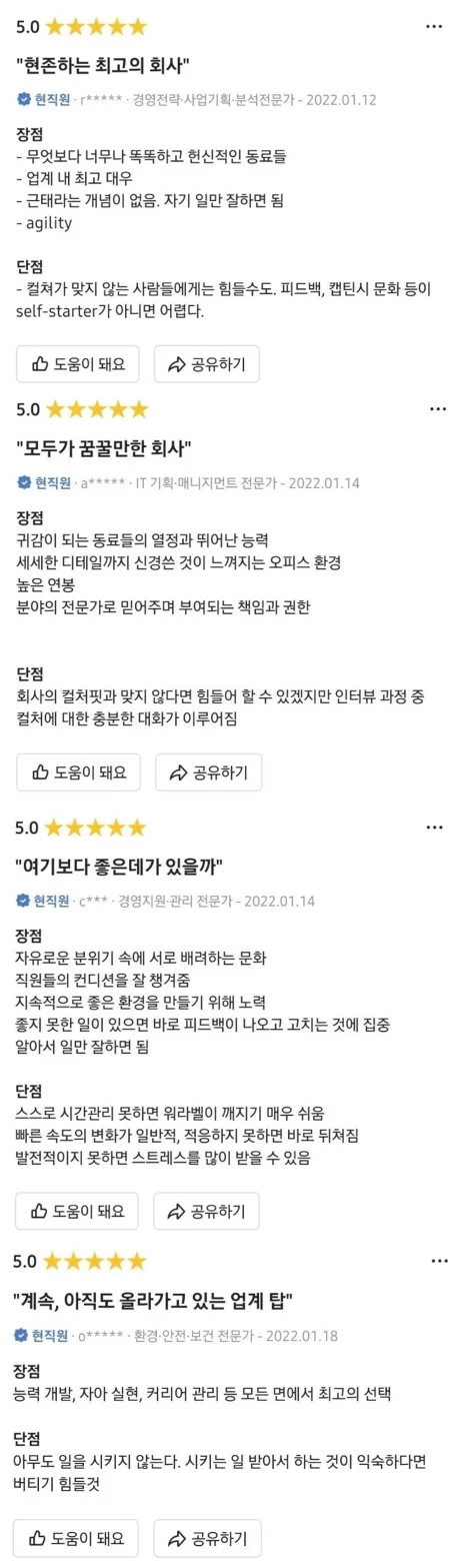 리뷰를 남긴 현직자들은 "여기보다 좋은 회사가 있을까", "모두들 꿈꿀 만 한 회사", 현존하는 최고의 회사", "프로들의 회사", "똑똑한 사람들'만' 모인 회사" 등 극찬을 아끼지 않았다.