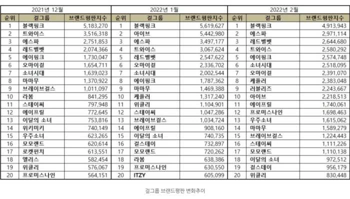 한국기업평판연구소는 지난 13일 ‘걸그룹 브랜드 2022년 2월 빅데이터 분석결과’를 발표했다. 해당 발표에 따르면 1위에는 블랙핑크가 이름을 올렸다.