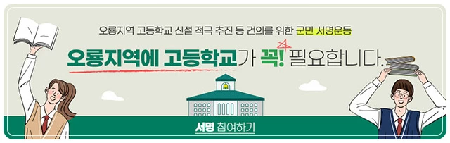이기회 자치행정과장은 “그동안 다양한 방법을 통해 오룡고 신설 건의를 추진해 왔으나, 군민들의 간절한 의견을 모아 직접 전달하는 것이 더욱 중요하다고 느껴 서명 운동을 추진하기로 했다”며“군민들의 의견을 도 교육청에 전달해 지역 내 교육여건 개선을 위한 사안들이 반영될 수 있도록 최선의 노력을 다하겠다”고 말하며 서명운동 동참을 당부했다.