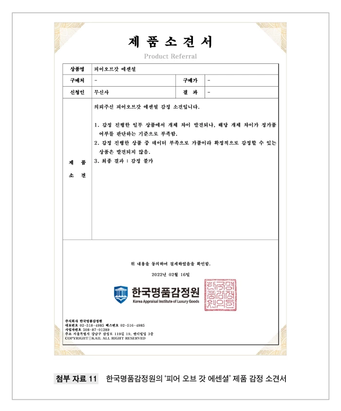 한국명품감정원 “가품이라 판단하기 어려워…감정 불가”