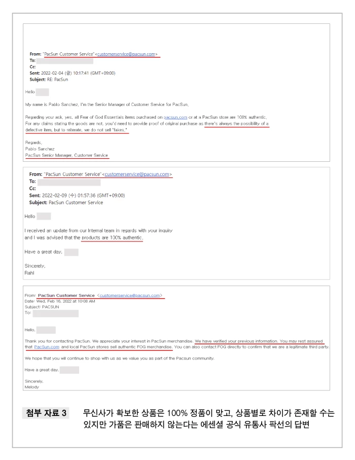 또 무신사는 이날 홈페이지 공지사항으로 에센셜 공식 유통처인 '팍선'도 따로 감정을 의뢰해 해외 감정원 '레짓 체크'에서 100% 정품이라는 결과를 받았다고 밝혔다. 그러면서 "브랜드의 정·가품 여부를 판가름하는 것은 해당 브랜드의 고유한 권한"이라며 "중개 업체에서 자의적인 기준에 근거해 검수를 진행하는 것은 브랜드의 공식적인 정품 인증 단계와 엄연히 다르고 공신력이 없다"라고 덧붙였다.
