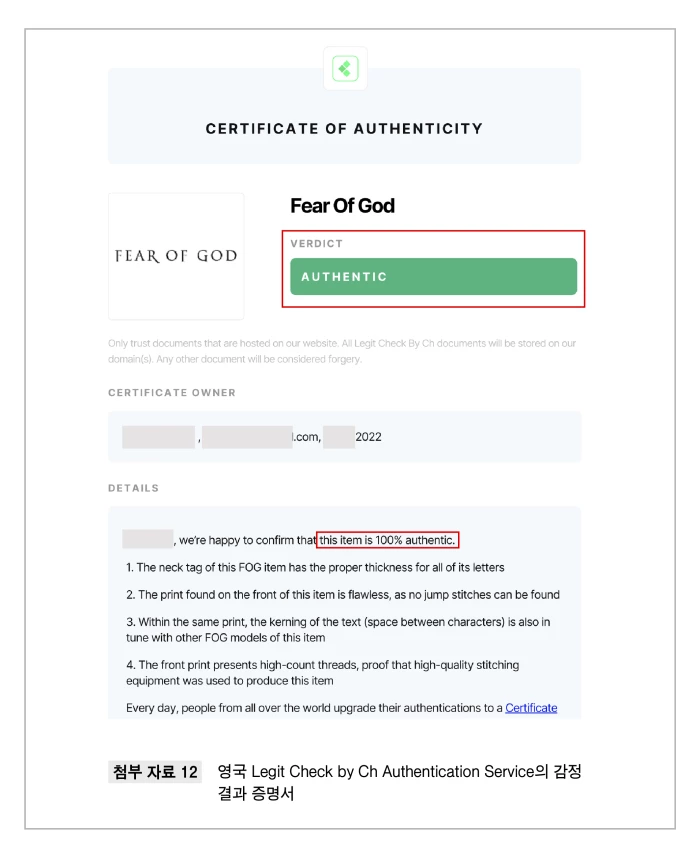 무신사 측은 22일 무신사 뉴스룸을 통해 "한국명품감정원이 짝퉁 논란에 휩싸였던 피어오브갓의 에센셜 티셔츠를 짝퉁이라고 판단하기 어렵다"라며 "감정 불가" 판정을 내렸다고 밝혔다. 한국명품감정원에 따르면 크림 측이 진품 감정법이라고 밝혔던 옷 라벨·봉제선 등은 개체 차이일 뿐 판정 기준으로 삼기 어려운 상태다.