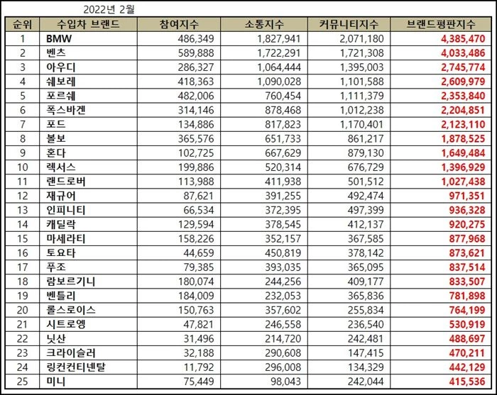 2022년 '2월 수입차 브랜드평판' 25위까지 전체 순위는 BMW, 벤츠, 아우디, 쉐보레, 포르쉐, 폭스바겐, 포드, 볼보, 혼다, 렉서스, 랜드로버, 재규어, 인피니티, 캐딜락, 마세라티, 토요타, 푸조, 람보르기니, 벤틀리, 롤스로이스, 시트로엥, 닛산, 크라이슬러, 링컨컨티넨탈, 미니 순으로 나타났다.