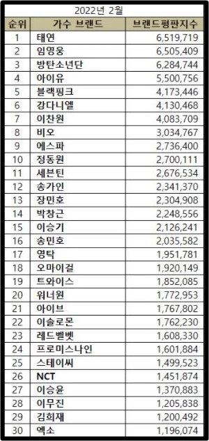 2월 가수 브랜드평판 10위권 여자 가수로 태연(1위), 아이유(4위), 블랙핑크(5위), 에스파(8위)가 이름을 올렸고, 나머지는 임영웅(2위), 방탄소년단(3위), 강다니엘(6위), 이찬원(7위), 비오(9위), 정동원(10위) 순인 것으로 발표됐다.