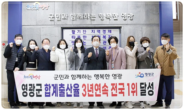 전남 영광군(군수 김준성)은 전국적으로 출생아 수가 감소하고 있는 가운데 합계출산율이 2019년, 2020년에 이어 2021년 잠정 통계에서 전국 1위를 달성하여 3년 연속 합계출산율 전국 1위를 달성하는 쾌거를 이뤘다고 밝혔다.