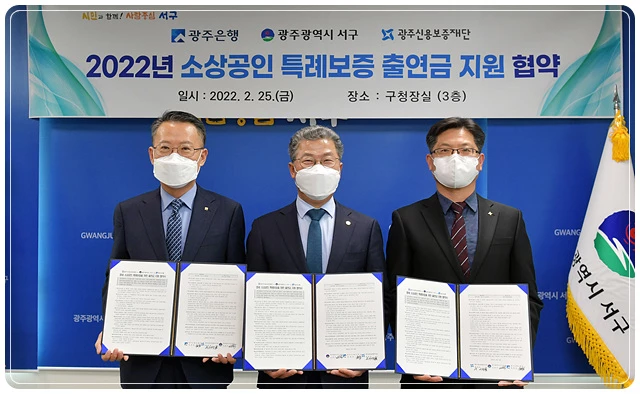 광주시 서구(구청장 서대석)가 코로나19 장기화로 어려움을 겪고 있는 지역 소상공인을 위해 지난 25일 ‘광주 서구 소상공인 특례보증 업무협약’을 체결했다고 밝혔다.