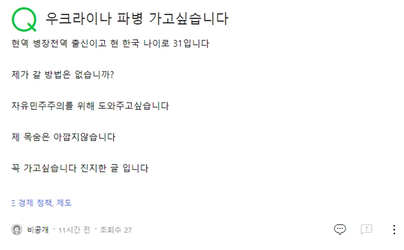 네이버 지식인의 한 작성자는 '우크라이나로 파병을 가고 싶다'는 제목의 글을 게재했다.