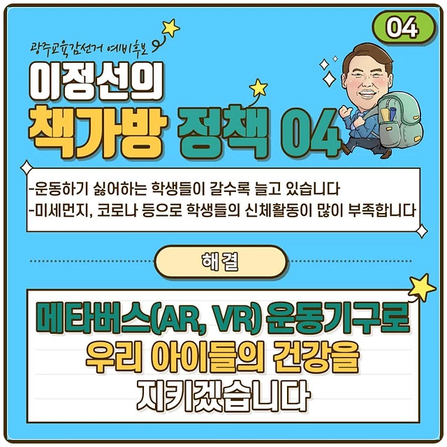 이정선 예비후보는 유튜브 ‘이정선TV'를 통해 발표한 ‘책가방’ 정책 4탄에서 “코로나 19로 인해 바깥 활동이 부족해지면서 우리 아이들의 건강을 지키기 위한 방안이 필요하다”며 “우리 아이들이 미세먼지나 황사 같은 환경에도 영향을 받지 않고 실내에서도 재미있게 집중해서 운동할 수 있는 메타버스 스포츠교실을 설치하겠다”고 말했다.