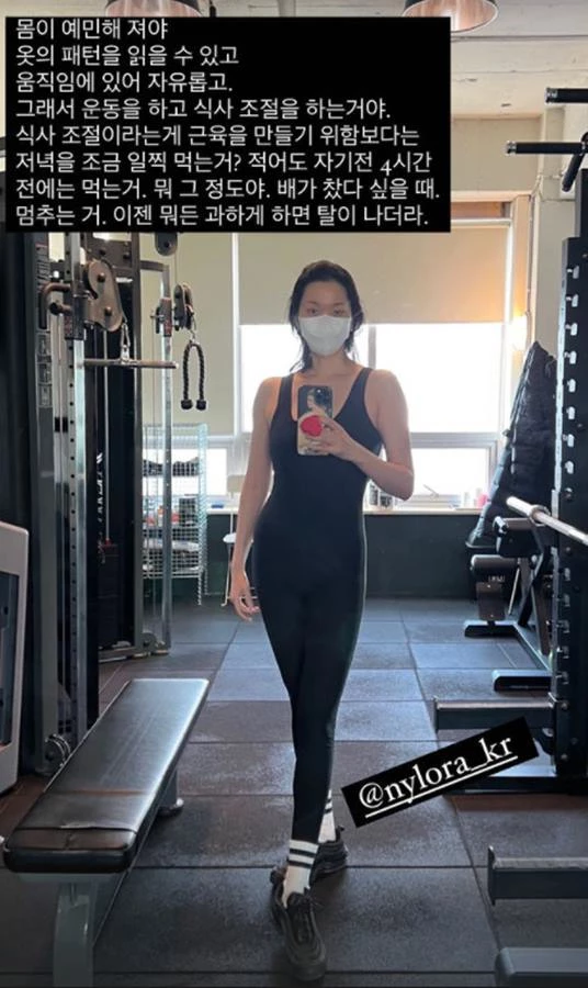 장윤주는 3일 자신의 인스타그램에 "몸이 예민해져야 옷의 패턴을 읽을 수 있고, 움직임에 있어 자유롭고 그래서 운동을 하고 식사 조절을 하는 거야"라는 글과 함께 한 장의 사진을 게재했다.