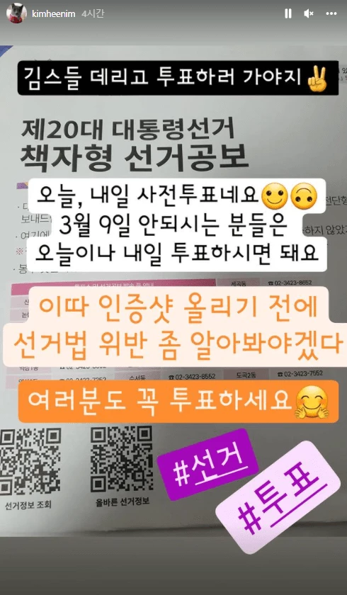 김희철은 4일 자신의 인스타그램 스토리에 "오늘 사전투표네요. 3월 9일 안 되시는 분들은 오늘이나 낼일 투표하시면 돼요"라는 글과 함께 제20대 대통령선거 책자형 선거공보를 사진으로 첨부했다.