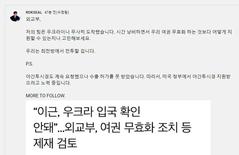 이후 이근은 인스타그램에 캠프 사진을 올리며 "외교부, 저의 팀은 우크라이나에 무사히 도착했다. 시간 낭비하면서 우리 여권 무효화하는 것보다 어떻게 지원할 수 있는지나 고민해 봐라"라며 외교부를 비난했다.